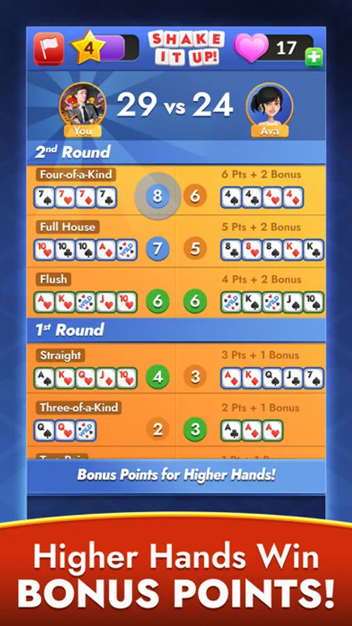 - The player with the higher card hand wins bonus points!