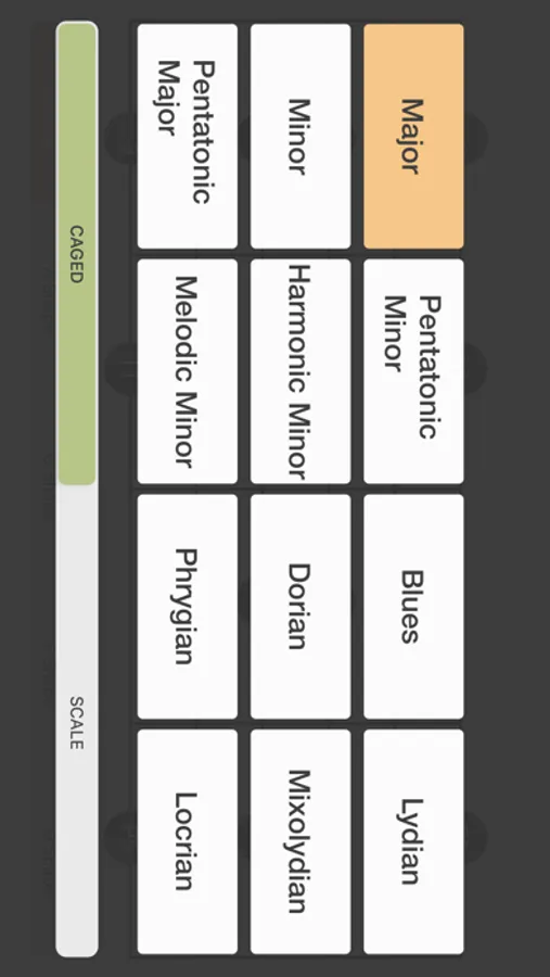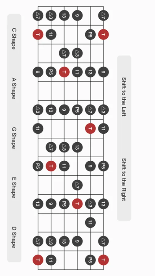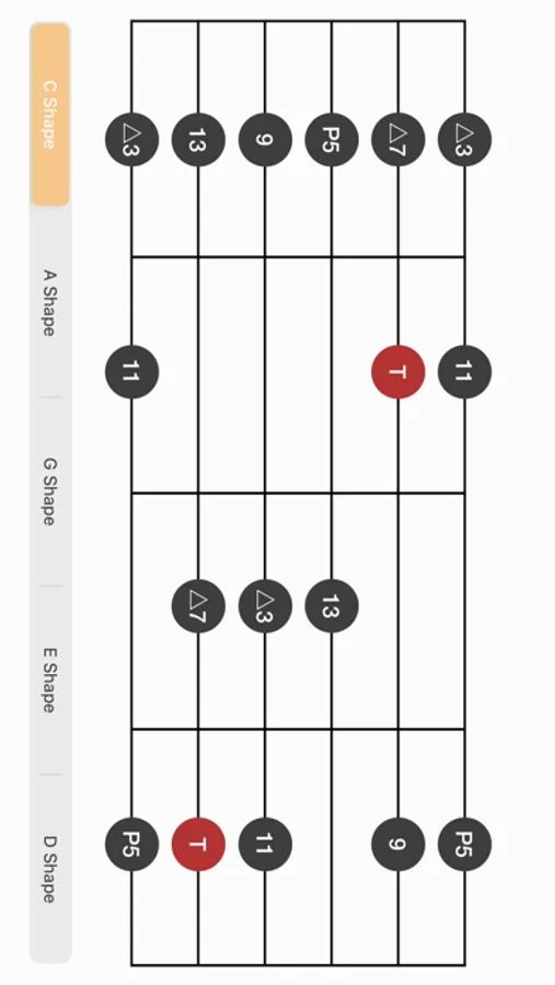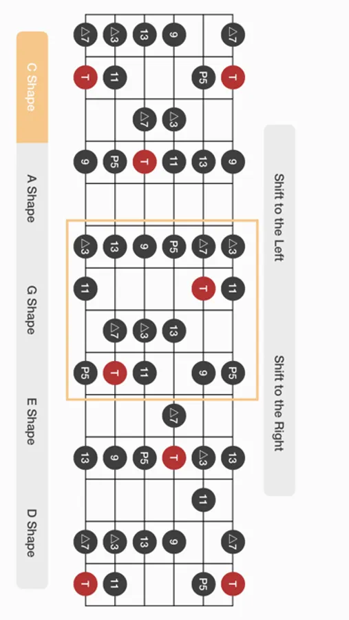 - The buttons on the bottom of screen shows where the shapes you remembered in the CAGED mode is.