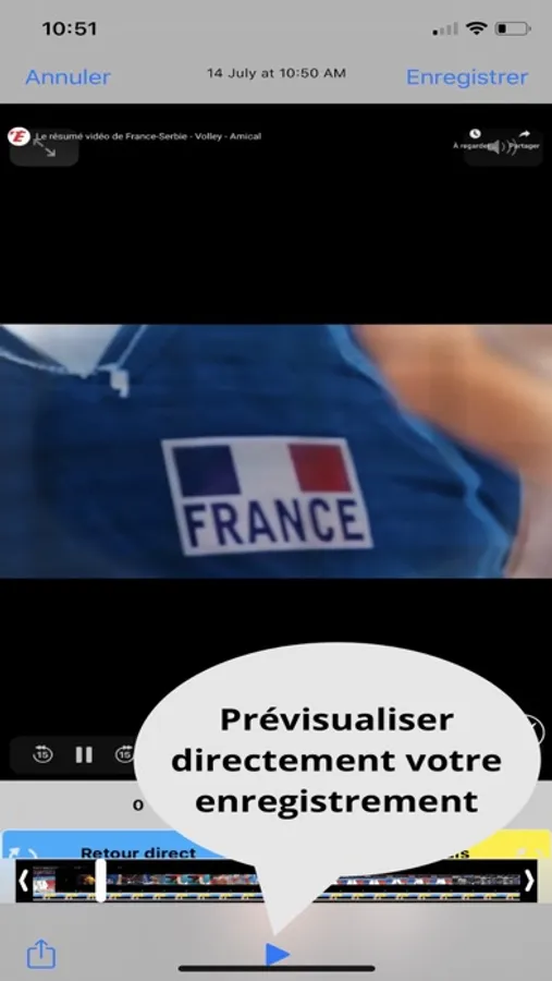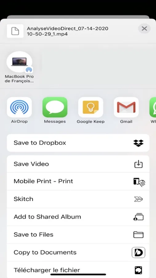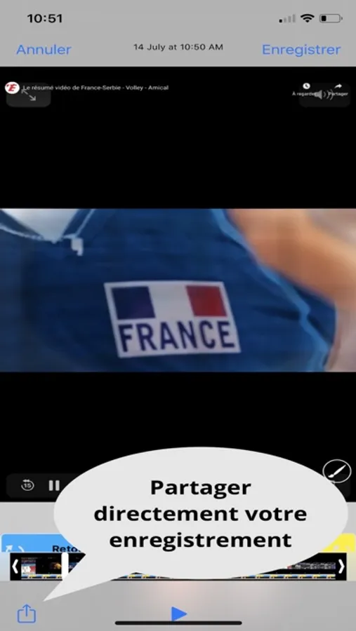 * Prévisualiser votre enregistrement et le partager via AirDrop ou d’autres moyens (Cloud,…) → Nous recommandons l’usage du bouton « partage » car le bouton « enregistré » peut faire émerger un « bug » si vous appuyez 2 fois de suite sur le bouton.
