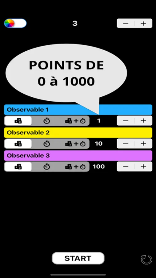 * Les modes utilisant les « points » peuvent être définis de 0 à 1 000 points. Idéal pour les adeptes du « score parlant » (1,10, 100 voire 1 000)