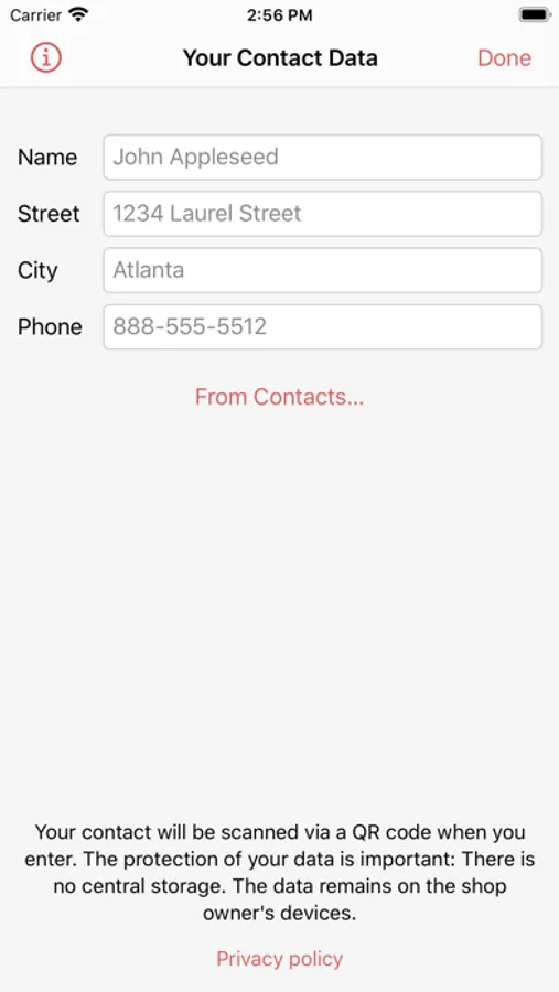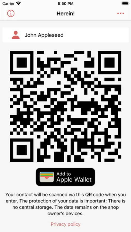 Additionally you can store the QR Code in your wallet. This allows you to show your contact details by double-tapping on the side button or the home button. The code even appears on your Apple Watch via the wallet app.
