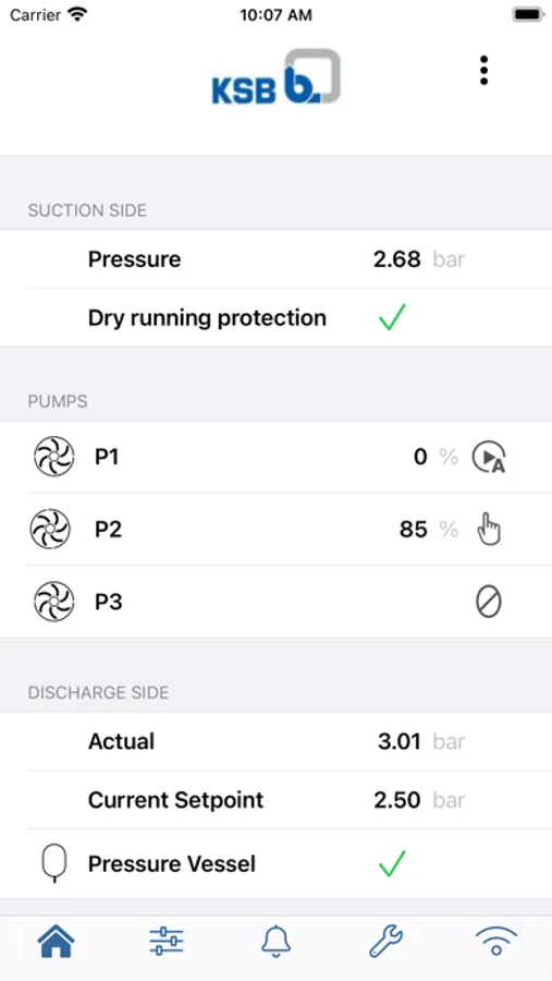 As soon as you are connected to the KSB Delta FlowManager app via the Bluetooth connection, you will be given an insight into the current status of the pumps, the pressures on the suction and pressure side and the programmed parameters.