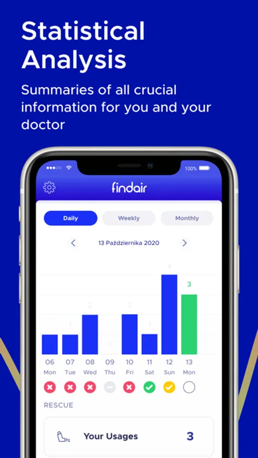 The key to proper asthma therapy is relevant data. Without it, neither you nor your doctor is able to make the right decisions. The app helps you easily collect data about every use of your rescue and regular drugs, your treatment progress, as well as environmental information such as air pollution, weather conditions and allergens in your area. FindAir also allows you to monitor the number of doses you have left in the packaging and predict when it will end.
