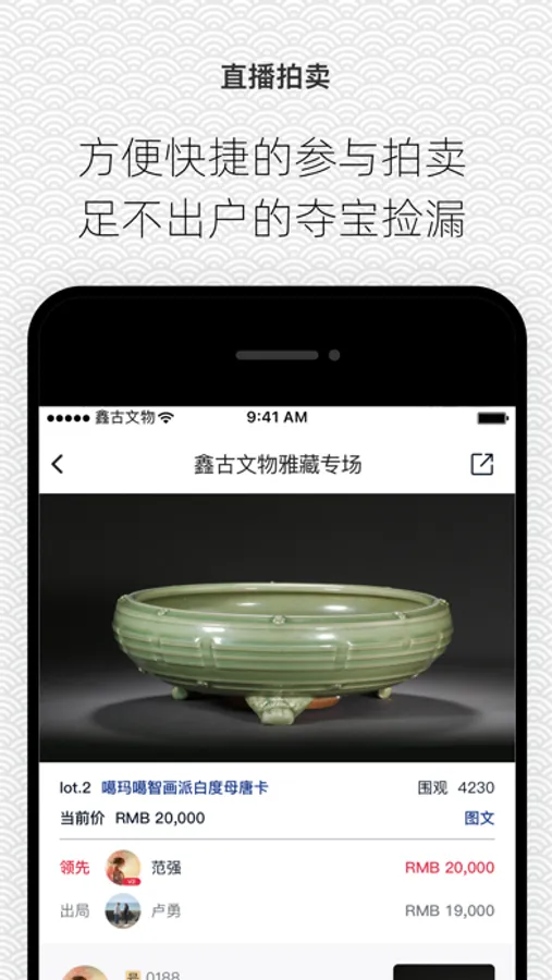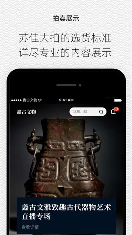 北京鑫古拍卖有限公司是一家文物拍卖文物拍卖公司。专注线上拍卖业务,严格征集把关,只征集开门有品质的拍品,以让收藏更安心为服务宗旨!拍品在品质严选基础上对拍卖规则施行保真制度,鑫古文物APP真正做到让您足不出户享受安心大拍!