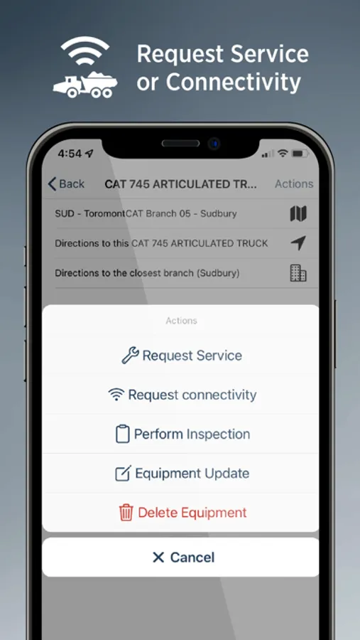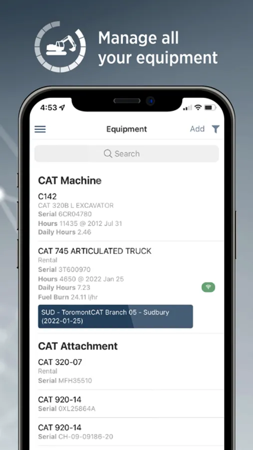 Manage all your registered and connected Toromont equipment by viewing configuration, location, hours, parts availability and more.