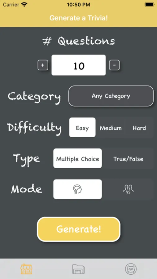 Select number of questions, category, difficulty, and question types(Multiple choice or True/False), and generate a trivia game!