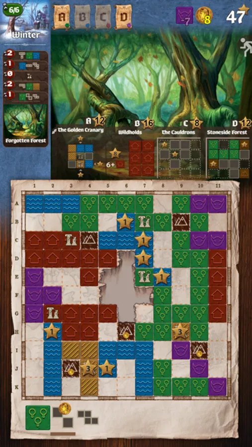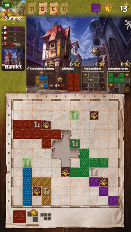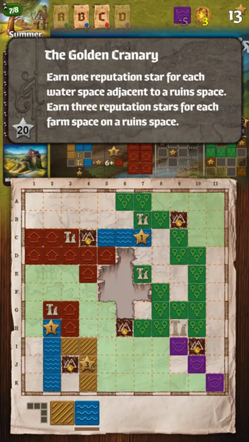 Queen Gimnax has ordered the reclamation of the northern lands. As a cartographer in her service, you are sent to map this territory, claiming it for the Kingdom of Nalos. Through official edicts, the queen announces which lands she prizes most, and you will increase your reputation by meeting her demands. But you are not alone in this wilderness. The Dragul contest your claims with their outposts, so you must draw your lines carefully to reduce their influence. Reclaim the greatest share of the queen’s desired lands and you will be declared the greatest cartographer in the kingdom.