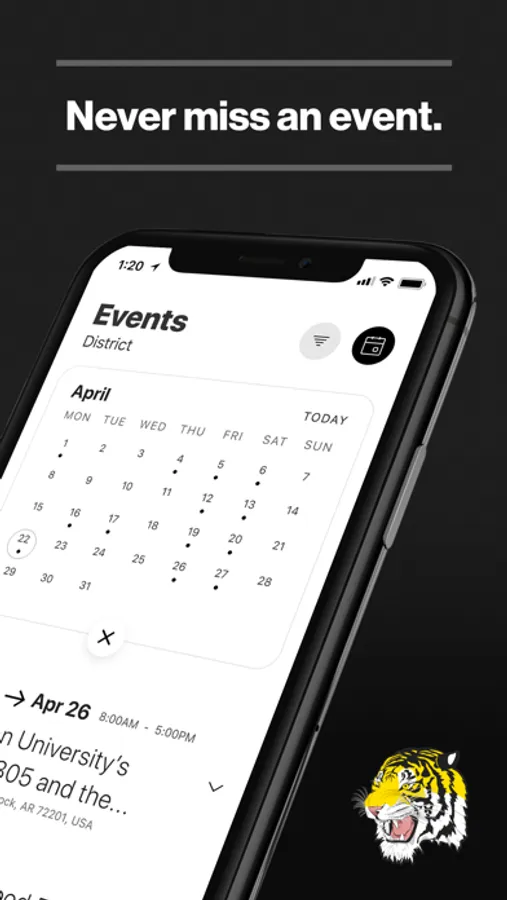 The event section shows a list of events throughout the district. Users can add an event to your calendar to share the event with friends and family with one tap.