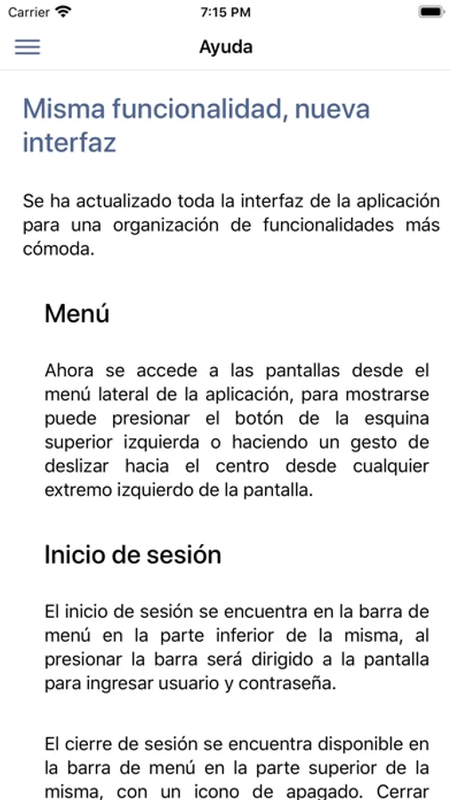 -Ahora se accede a las pantallas desde el menú lateral de la aplicación, para mostrarse puede presionar el botón de la esquina superior izquierda o haciendo un gesto de deslizar hacia el centro desde cualquier extremo izquierdo de la pantalla.