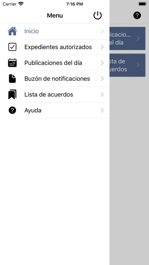 -El cierre de sesión se encuentra disponible en la barra de menú en la parte superior de la misma, con un icono de apagado. Cerrar sesión no modifica ninguno de sus datos personales ni de sus expedientes.