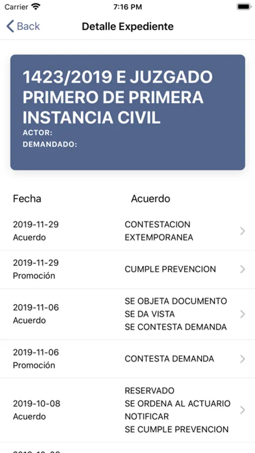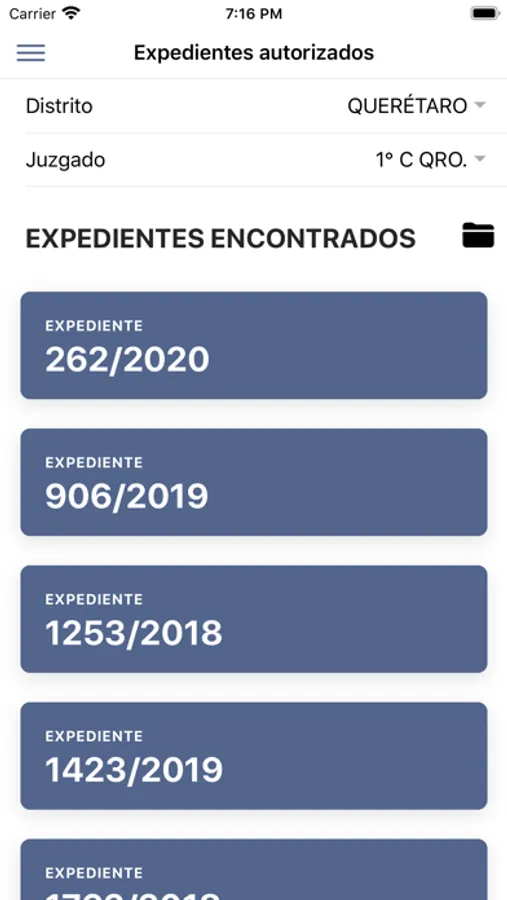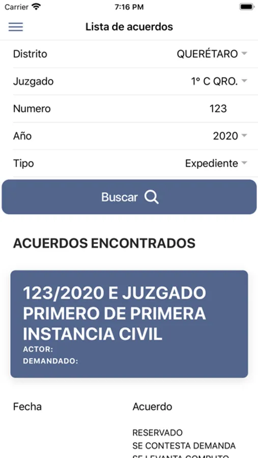 -Para buscar un expediente diríjase a la pantalla "Expedientes autorizados", seleccione Distrito y Juzgado, presione el botón "Buscar" para que se muestren los expedientes sobre los cuales usted tiene personalizad jurídica. (En caso de no encontrar el expediente esperado comuníquese con el juzgado correspondiente para solicitar el acceso) se mostrarán unas tarjetas con número de expediente, presione la deseada para ver todos los datos relacionados con el mismo. Puede presionar los acuerdos para visualizar el documento específico de cada fecha.