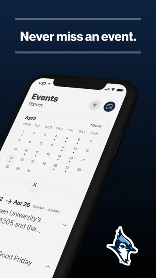 The event section shows a list of events throughout the district. Users can add an event to their calendar to share the event with friends and family with one tap.
