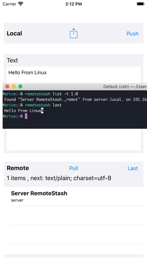Then from a shell you can push a text or a picture from the command line to the app or a photo from your phone to the shell.
