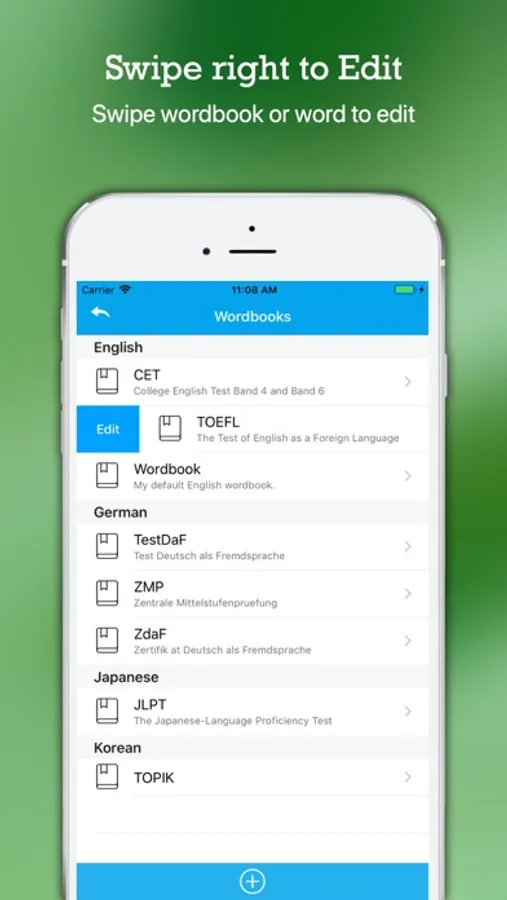 + Swipe right to Edit: Swipe wordbook or word to edit