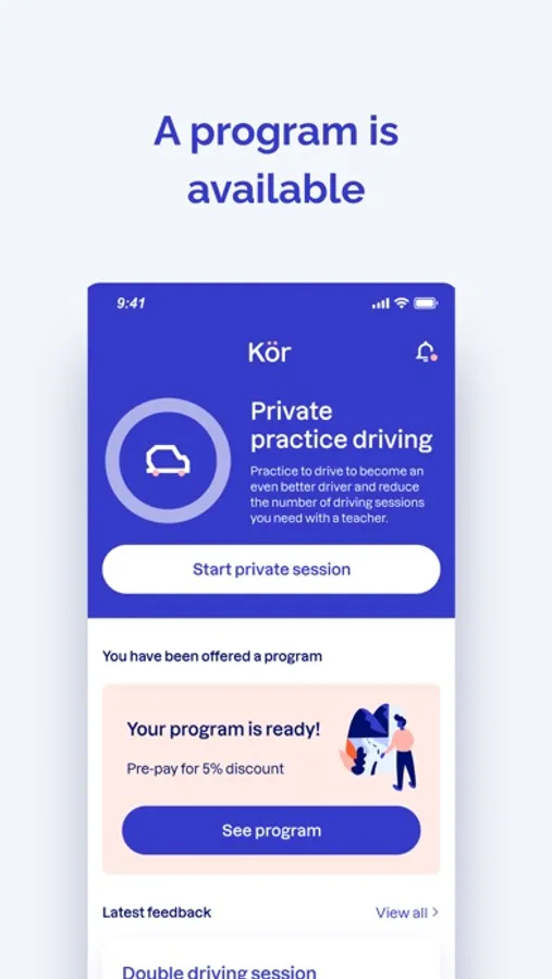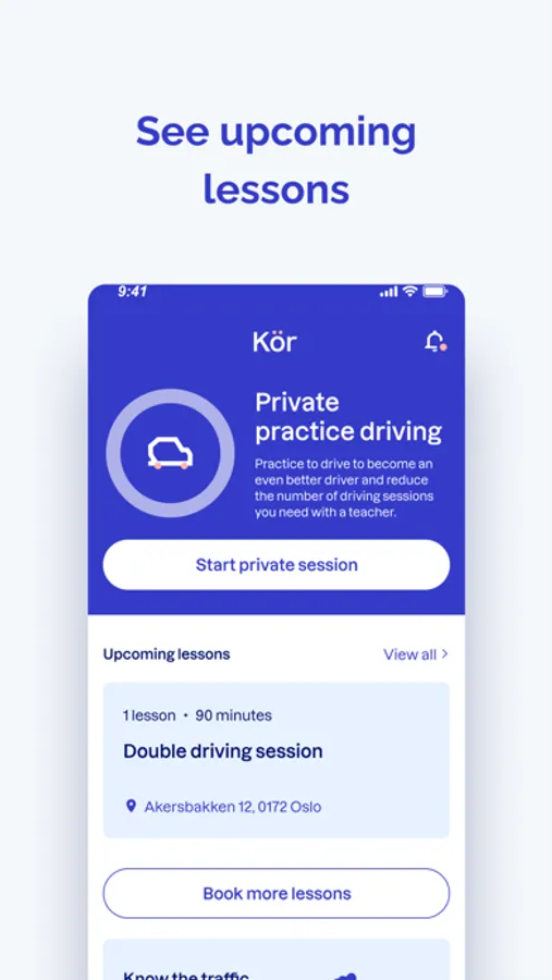 Kör makes the road to the driver’s license easier! With our app you can book- and change driving lessons, get feedback from the traffic instructors, choose where you want to start the lessons, follow your progress, practice theory quizzes, track your practice driving and much more!