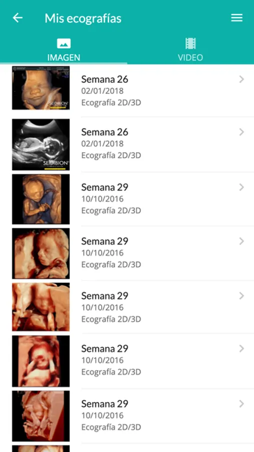 La App sabrá en qué día y semana de la gestación se encuentra la paciente y mostrará información, ilustraciones, ecografías 2D y 3D del momento actual.