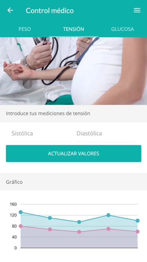 De manera autónoma, la paciente podrá registrar su peso, tensión y valores glucémicos. Dispondrá de detallados gráficos de control que garantizan una ganancia de peso saludable.