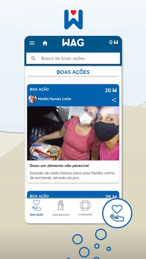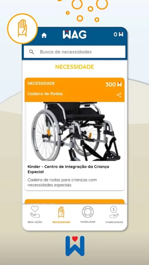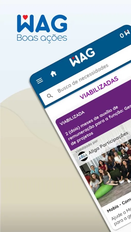 WAG é uma plataforma colaborativa do bem. Cada boa ação que você fizer e registrar na plataforma vai gerar pontos virtuais, os WAGs. Na aba ""Necessidades"", você pode encontrar uma causa social que precise de ajuda e doar seus WAGs. Quando a iniciativa atingir a quantia suficiente, ela poderá ser viabilizada por uma pessoa ou empresa.