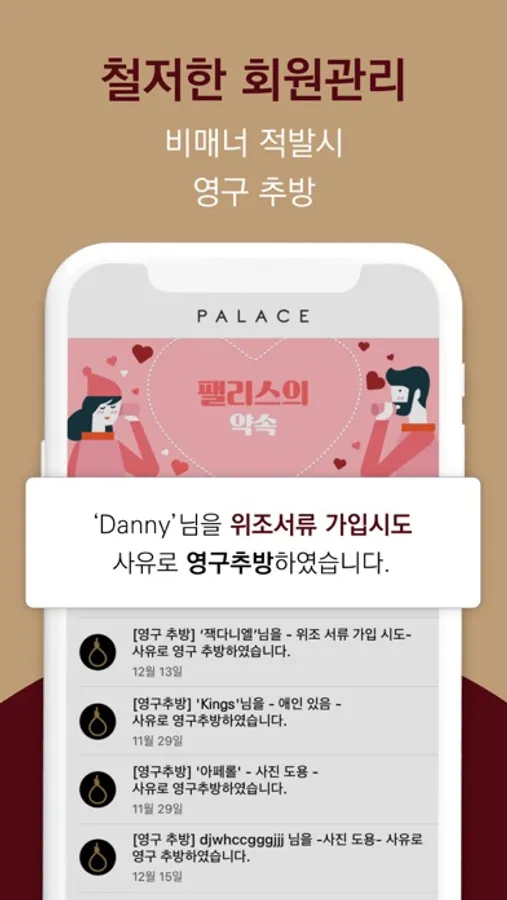 팰리스는 회원분들의 건전하고 즐거운 만남을 진심으로 기원합니다. 회원분들이 안심하고 만날 수 있도록, 비매너 회원을 강력하게 처벌하고 있습니다. 비매너 행위가 적발될 경우 해당 회원을 영구 추방함은 물론이고, 해당 회원을 비매너 게시판에 기록하고 해당 회원과 매칭된적이 있는 모든 회원에게 알림을 보내드립니다.