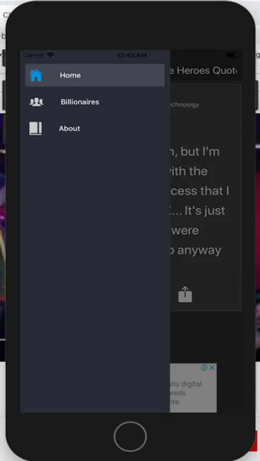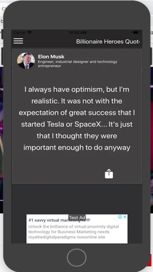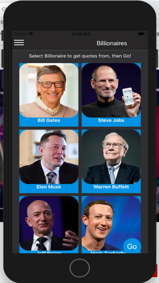 Billionaire Heroes Quotes is an OFFLINE application which has tons of quotes from your favourite top notch, hero Billionaires, whether it is Bill Gates or Steve Jobs, Elon Musk or Mark Zuckerberg, Warren Buffett or Jeff Bezos, there is something for you.