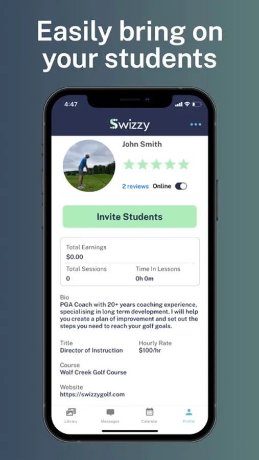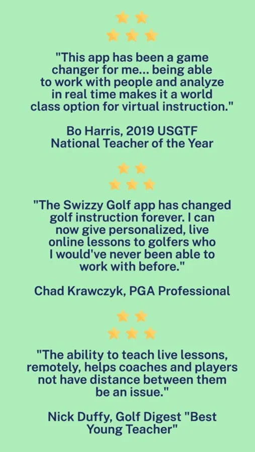 Conduct virtual lessons, make money and network with students on your time. Download the Swizzy Golf Instructors app and start giving live virtual lessons. You can now directly connect with new and existing clients around the world. No more rainouts, video-email struggles or remote coaching difficulty. All you need is your mobile device or tablet and the Swizzy Golf - Instructors app to provide high quality lessons.