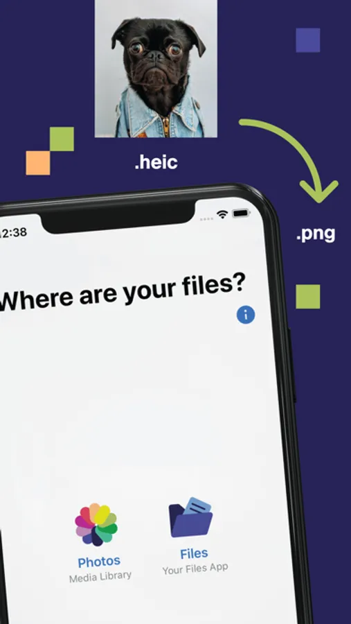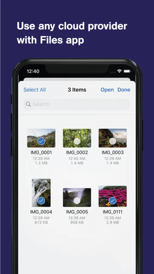 * Find your photos in albums or choose files from iOS Files app