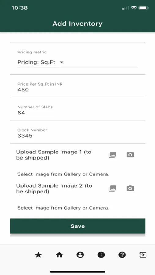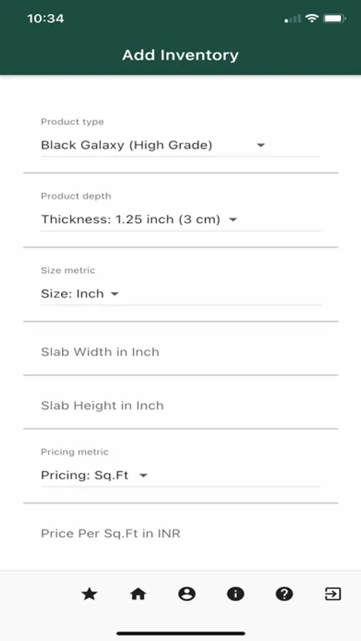 > App users can add granite slabs listing the slab width, height and thickness, price and two sample images, using 'Add Inventory' feature. Based on the thickness chosen, bundles with 7 slabs for 3 cm thickness or 10 slabs with 2 cm thickness will be added as available inventory.