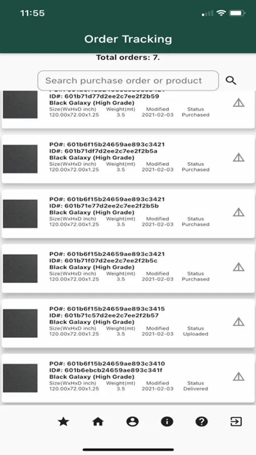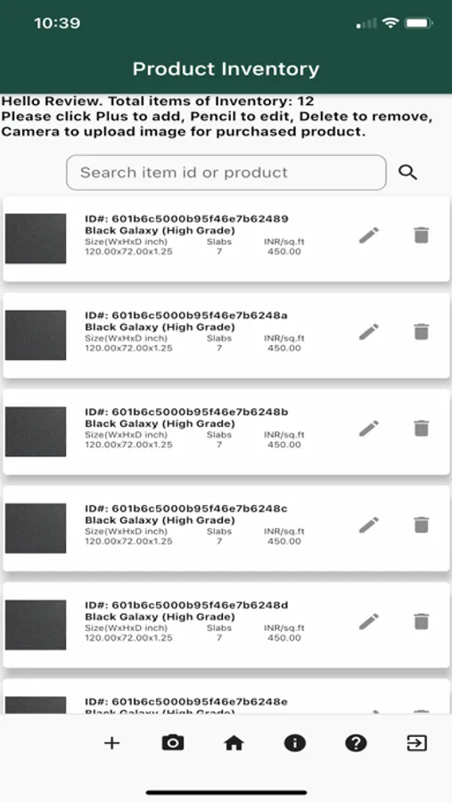 > App users can view the bundles of the granite slabs aded earlier, along with the specifications using the "Product Inventory" feature
