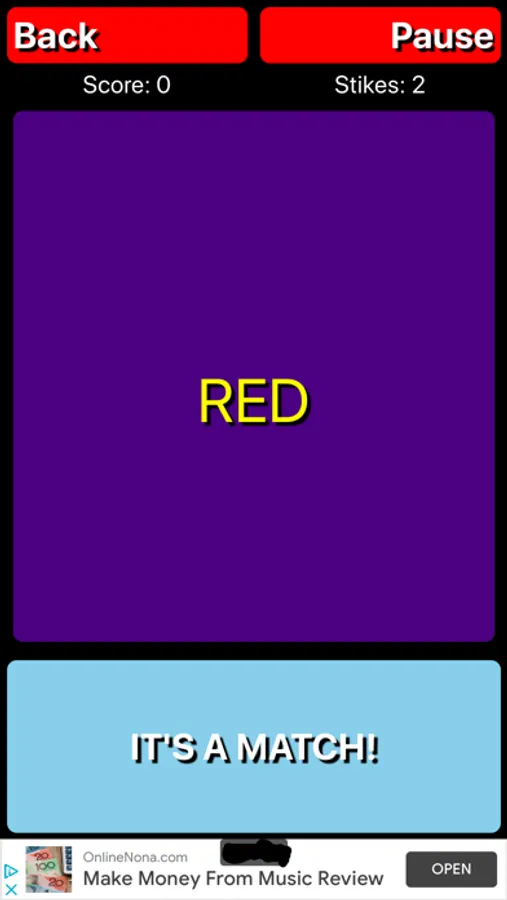 Tap the button when the background matches the color word but don't get tricked as the color words color does change at higher difficulties. Aim for high scores; practice, and make it a part of your routine to improve your reaction time and other cognitive skills.