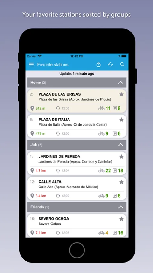 - List of favorite stations categorized by groups (home, work, friends or general).
