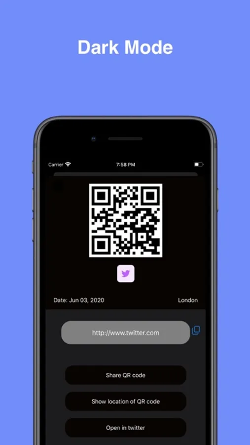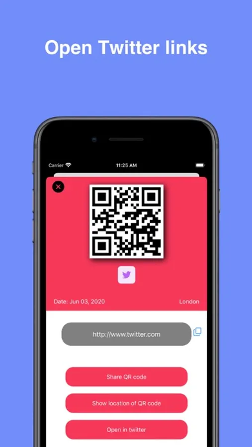 Just point the camera at any QR code and the app will display the scanned content. Twitter links, Facebook, URLs, numbers, and more.
