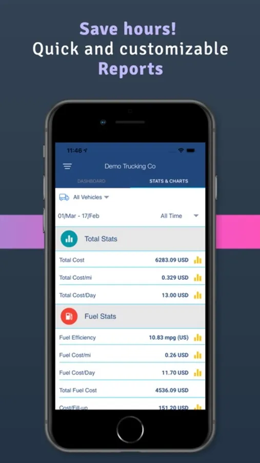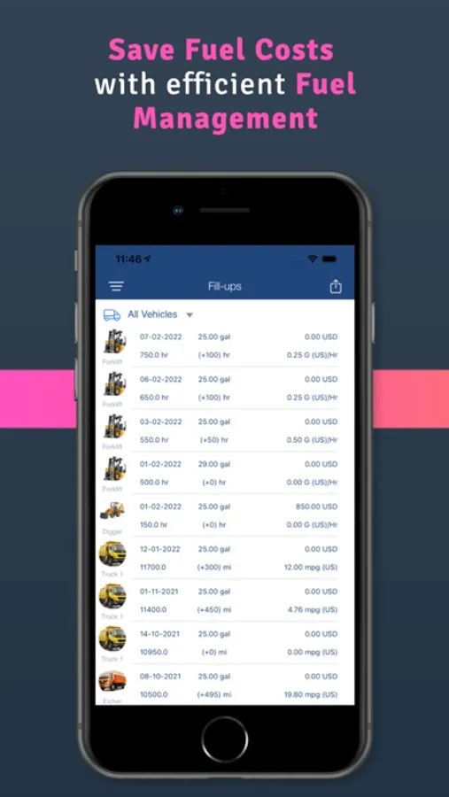 * Fuel management: Get real-time updates with every fill-up. The assigned driver can upload receipts and other information for every fill-up. You can also measure fuel consumption for machines and equipment with Hour Meters for heavy equipment and equipment fleets. All this data is stored on the cloud and available for the admin to view. Get in-depth reports and analysis of the vehicle's fuel costs and efficiency.