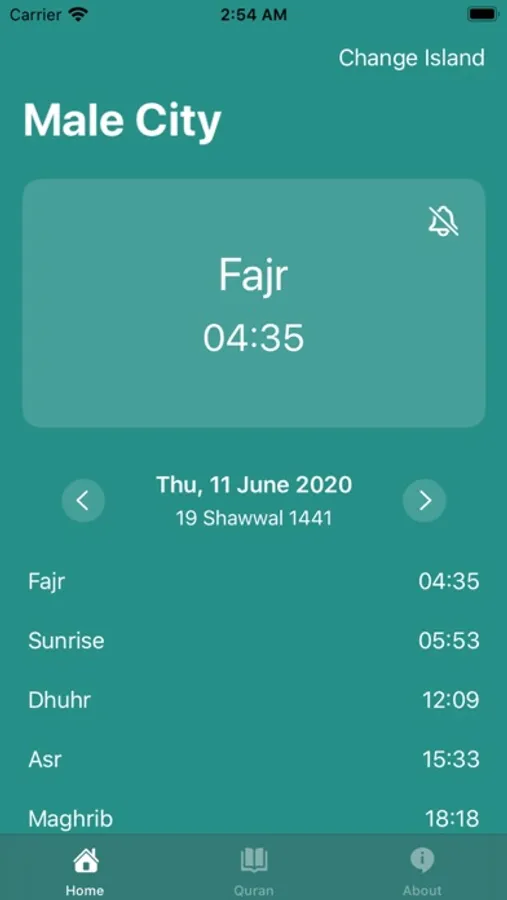 The app displays prayer times for almost all islands of Maldives in an aesthetically designed Home screen. You can enable and disable notifications for the prayer times.