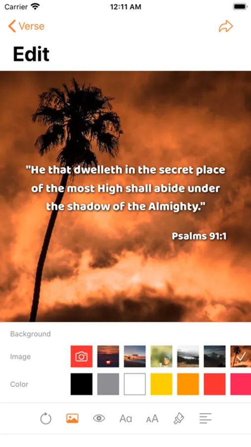 When sharing a verse you can select beautiful images from the app or if you prefer you can choose your own photos from the gallery and use them as a background. Your verses will look beautiful!