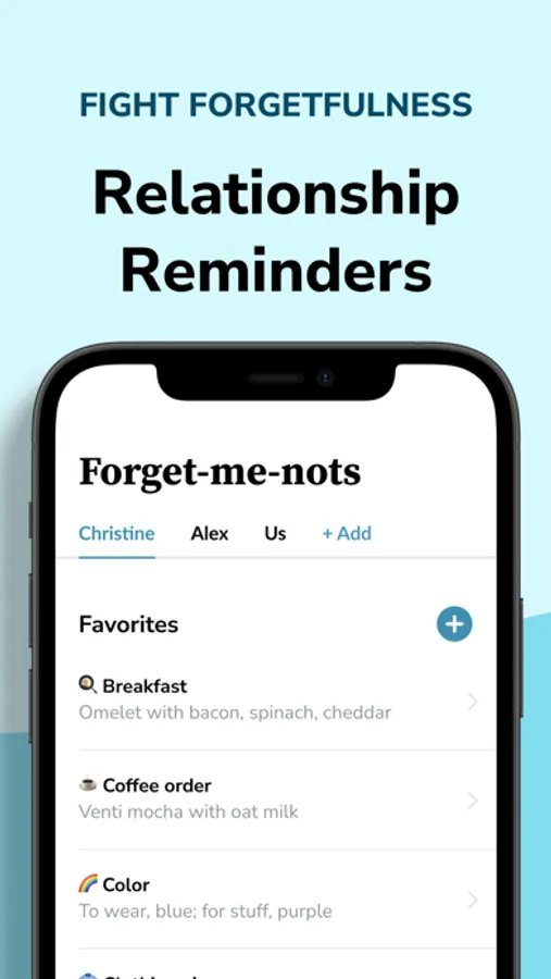 Our “Forget-me-nots” feature empowers couples to be thoughtful more easily with notes, relationship reminders, and a shared couple calendar of important dates. Write down important dates like anniversaries, family birthdays, and preferences like coffee orders, favorite flowers, and clothing sizes, all in one place.
