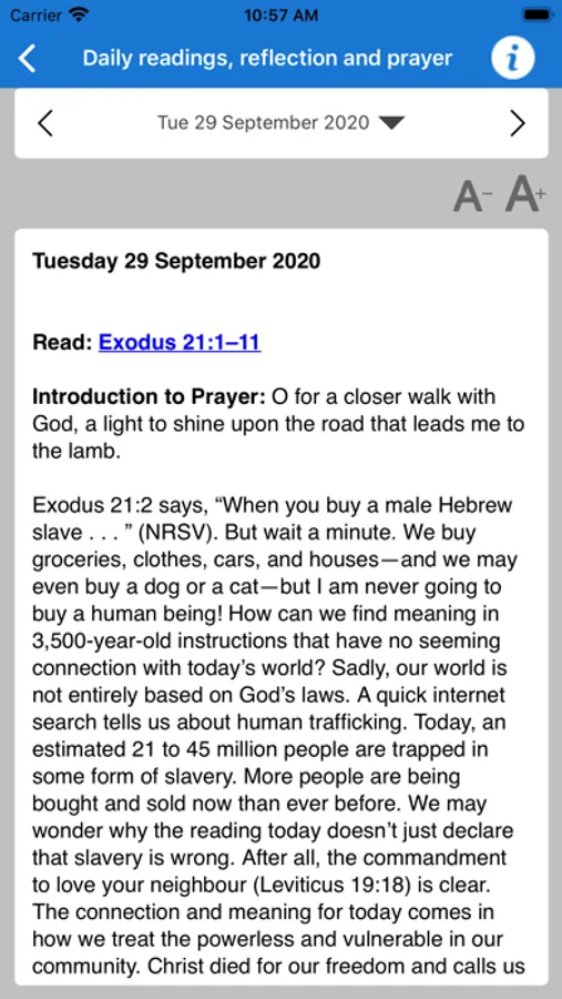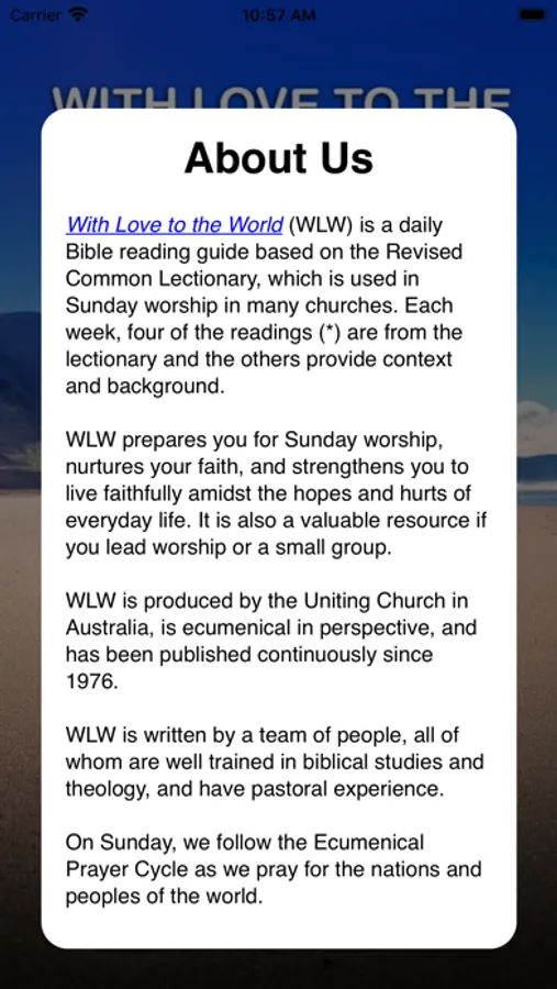 With Love to the World (WLW) is a daily Bible reading guide based on the Revised Common Lectionary, which is used for Sunday worship in many churches. Our app prepares you for Sunday worship, nurtures your faith, and strengthens you to live faithfully amidst the hopes and hurts of everyday life. It is also a valuable resource for worship and small group leaders. Produced by the Uniting Church in Australia, WLW is ecumenical in perspective, and has been published continuously since 1976. It is written by an expert team of people well trained in biblical studies and theology, and with pastoral experience.