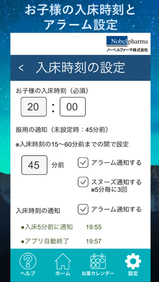 毎日、就寝前に服用が必要な入眠改善剤の服用時刻や、お子様がおやすみになる入床時刻をアラームでお知らせし、服用をサポートします。