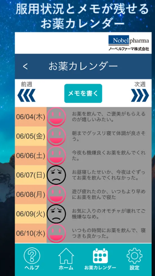 - お薬カレンダーで服用状況を確認でき、メモを残すこともできます。