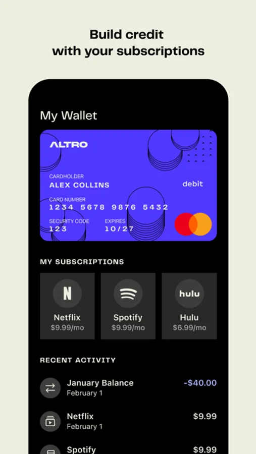 Traditionally, one of the only ways to build a credit score is by having a credit history. We help you earn credit by starting with the recurring payments you’re already making with your subscriptions. With Altro, every payment counts.