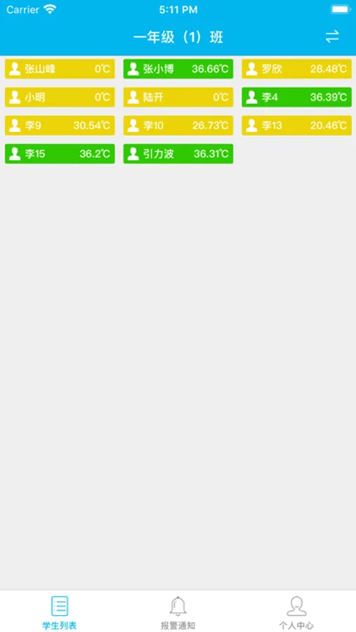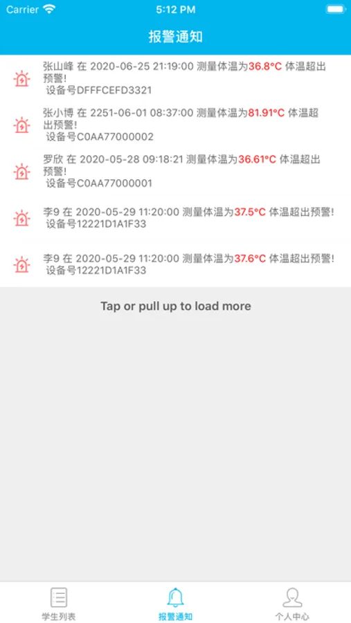 4.查看报警信息列表,提醒那位学生体温异常注意观察。