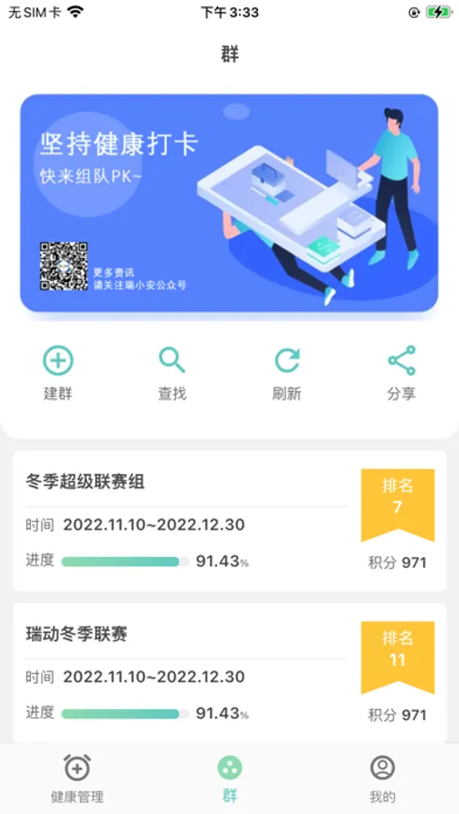 自由组群开展健康竞赛,进行健康行为PK,让您的健康管理道路更加轻松有趣、更有动力与激情,互相鼓励,与亲友共同实现健康目标。