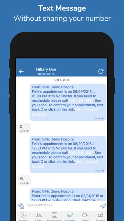 **Please note that this feature ONLY works if you have a texting number set up with VINx or are using VetTools Origin landline texting! Otherwise your mobile phone number will appear as the sender. Contact us at VINxSupport@vin.com to confirm or get started.