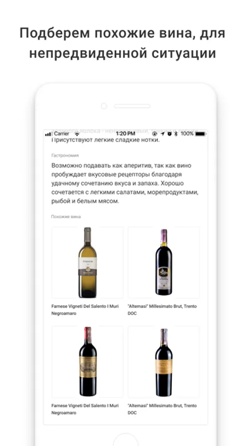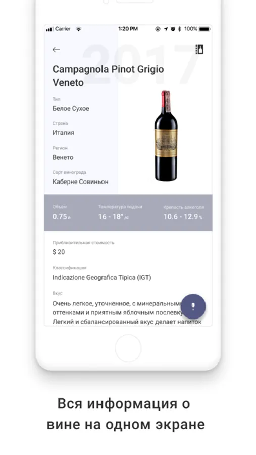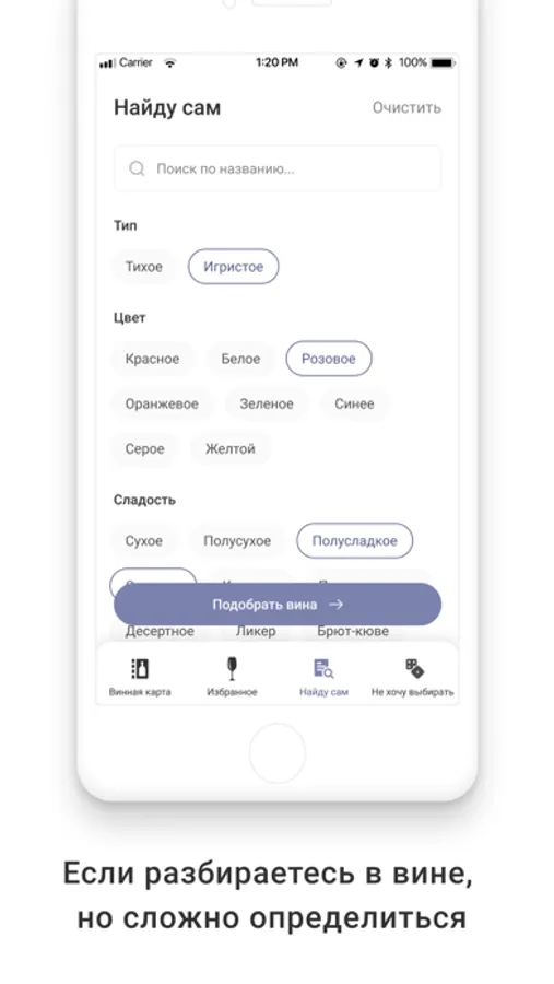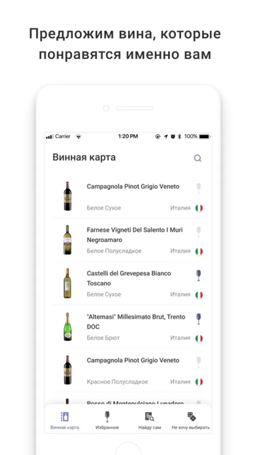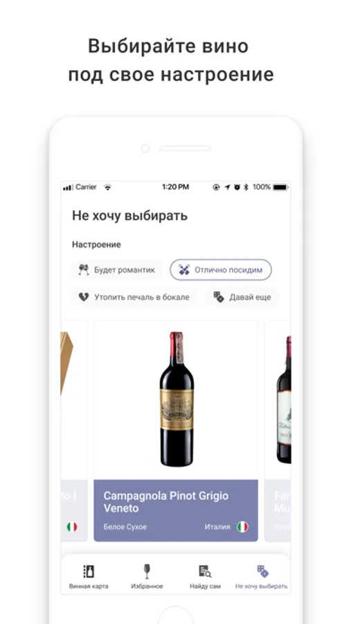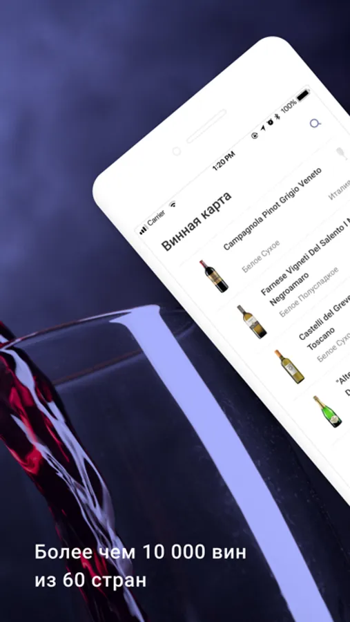 Самая большая база вин теперь доступна прямо в Вашем телефоне. Вы можете подобрать вино исходя из личных вкусов, предпочтений и многого другого, а режим автоматического подбора предложит варианты вин исходя из Вашего настроения.