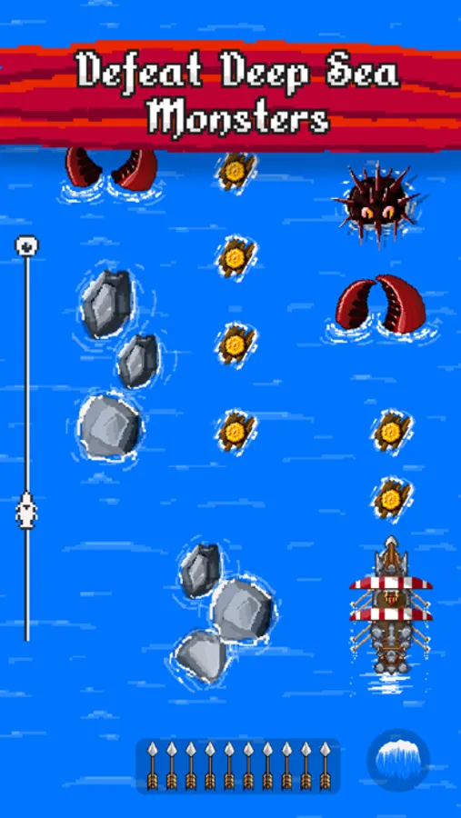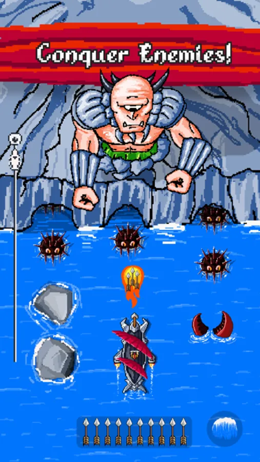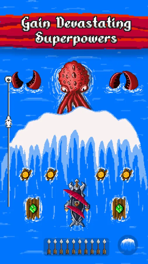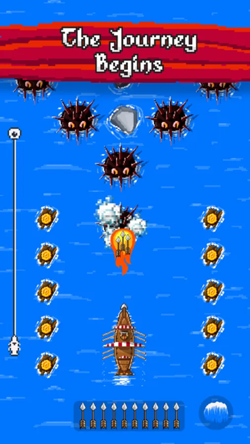 Collect coins and crystals to help you on your journey back to Ithaca. There are 3 different types of boats within the game. A wooden boat, a stone boat, and a forged steel boat. The forged steel boat is the most durable and contains the ability to collect forcefield crystals, which give the boat immunity from objects and enemies for about 5 seconds. When enemies are destroyed coins can be collected. Coins can be use to buy green crystal power-ups. These power-ups allow players to use dominant tidal waves to defeat enemies. Don't use all your coins on power-ups however, because you need them to reload your arrows!