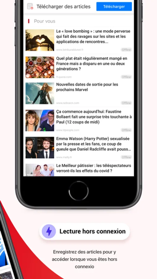 Enregistrez des articles sur votre téléphone lorsque vous êtes sur le wifi, et lisez les plus tard hors connexion, sans consommer de données mobiles.