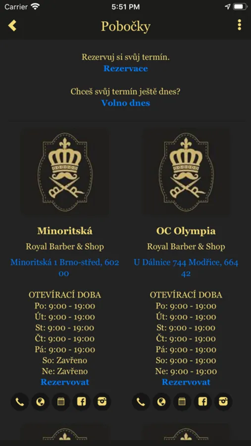 Aplikace podporuje věrnostní program, slevové kupony pro zákazníky Royal Barber & Shop. Umožňujě rychlou rezervaci a snadnou komunikaci se zákazníkem. Táké zde najdete vida naších barberů a naše partnerské společnosti. Informace o pobočkách Royal Barber & Shop kde najdete otvírací dobu, tel číslo, instagram, facebook a adresu.