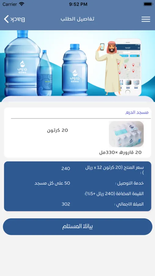 تطبيق جدوي تطبيق متخصص في بيع المياة عن طريق اختيار عدد القارورات و المكان المراد توصيل اليه و يتم التوصيل الي المكان المحدد بكل سرعة و أمان