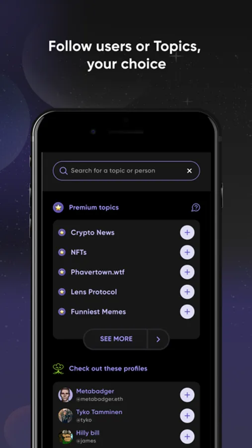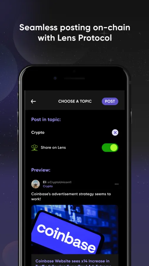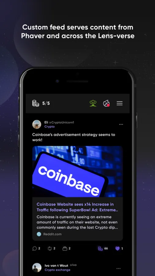 Phaver's decentralized social app brings you the best of Web3 without the complex UX that usually comes along with it. Access the Lens Protocol social graph even without a Lens profile or make your own on-chain posts and follows by connecting your Lens to Phaver. Gamified features help your posts reach more people and reward you with points that will be tradeable for tokens in the future and multi-wallet support allows you to showcase all your coolest NFTs, from Apes to soulbound tokens.