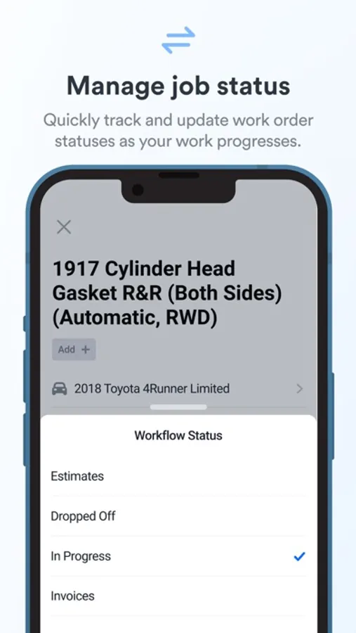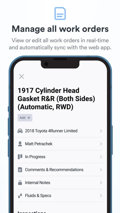 + Real-Time Updates - Create and update customer, vehicle, and work order details right on the mobile app, without having to run to your service writer.