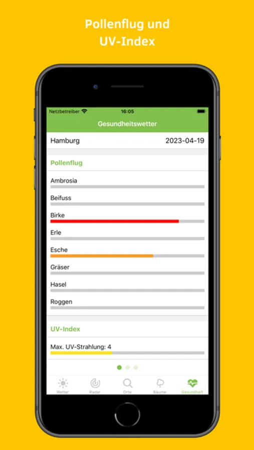 Das Gesundheitswetter zeigt dir aktuelle Informationen zum Pollenflug und informiert dich so zuverlässig über die Belastung von Pollen und Gräser. Außerdem wird mithilfe des UV-Indexes die maximale UV-Strahlung angezeigt.